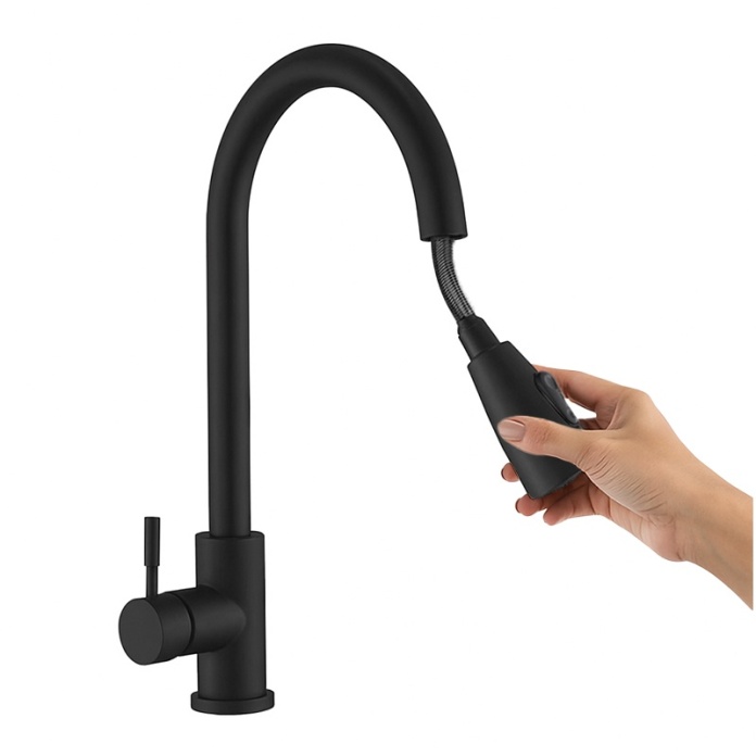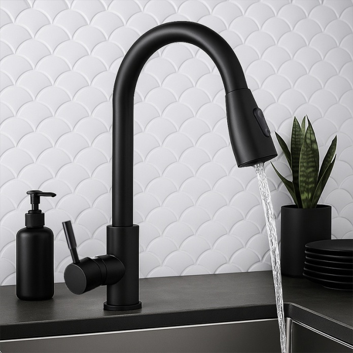 - Nowoczesny wygląd – Prosta forma i czarne wykończenie nadają baterii elegancki, a zarazem uniwersalny charakter, który doskonale odnajduje się w nowoczesnych, minimalistycznych oraz klasycznych wnętrzach kuchennych.