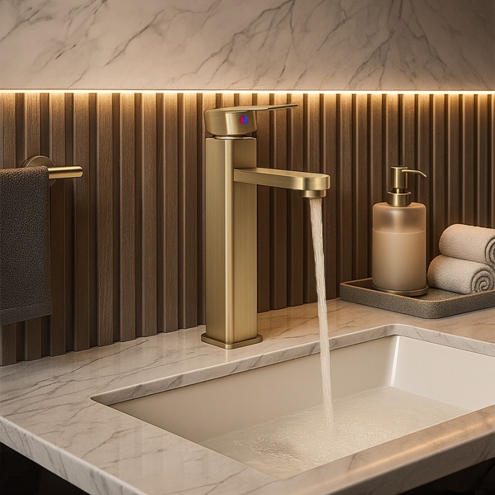 Bateria umywalkowa Hydrosan to eleganckie i nowoczesne rozwiązanie zaprojektowane z myślą o komforcie użytkowania oraz trwałości. Wykonana z wysokiej jakości mosiądzu, doskonale sprawdzi się w nowoczesnych wnętrzach łazienkowych, szczególnie w połączeniu z umywalkami nablatowymi. Jej minimalistyczna forma i precyzyjnie wykonane detale tworzą spójną, estetyczną całość, która podkreśli charakter każdej aranżacji. Model wyposażony jest w trwałą ceramiczną głowicę, która umożliwia płynną i precyzyjną regulację temperatury oraz strumienia wody, zapewniając wygodę codziennego użytkowania. Zintegrowany perlator napowietrza strumień, ograniczając zużycie wody i zwiększając jej efektywność, co przekłada się na oszczędność i większy komfort użytkowania. Zastosowanie mosiądzu sprawia, że bateria wyróżnia się odpornością na korozję, matowienie oraz działanie wysokich temperatur. Dzięki temu zachowuje swoje właściwości i estetyczny wygląd nawet przy intensywnej eksploatacji.