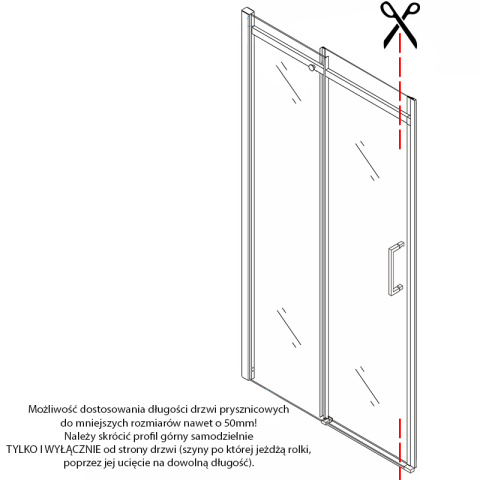 - Możliwość dostosowania długości drzwi prysznicowych do mniejszych rozmiarów nawet o 50mm! Należy skrócić profil górny samodzielnie TYLKO I WYŁĄCZNIE od strony drzwi (szyny po której jeżdżą rolki, poprzez jej ucięcie na dowolną długość).