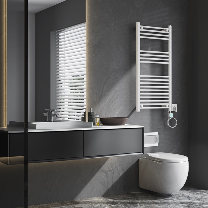 - Stylowy wygląd – Nowoczesna forma, biała powłoka i smukła konstrukcja (tylko 43 mm głębokości) sprawiają, że grzejnik doskonale prezentuje się w każdej łazience – to elegancki dodatek do wnętrza.
