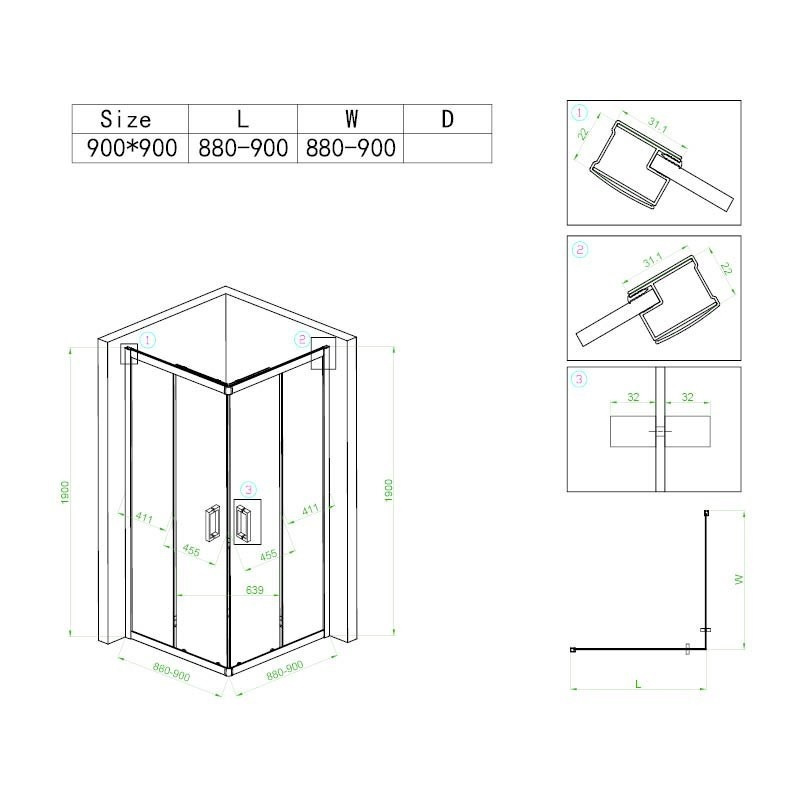 • Ścianka A oraz B: 880 - 900 mm