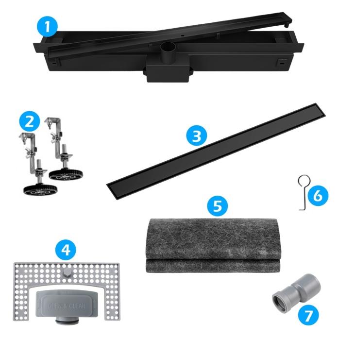 - Kompletny podtynkowy odpływ liniowy, ścienny, prysznicowy