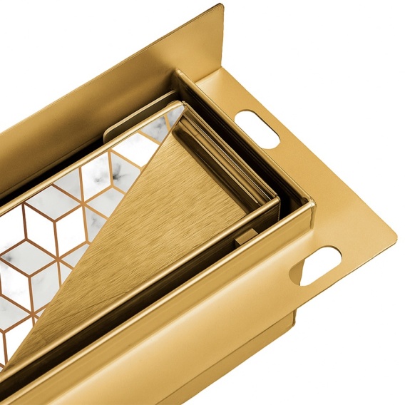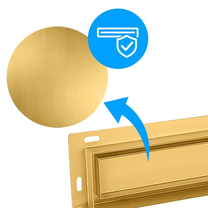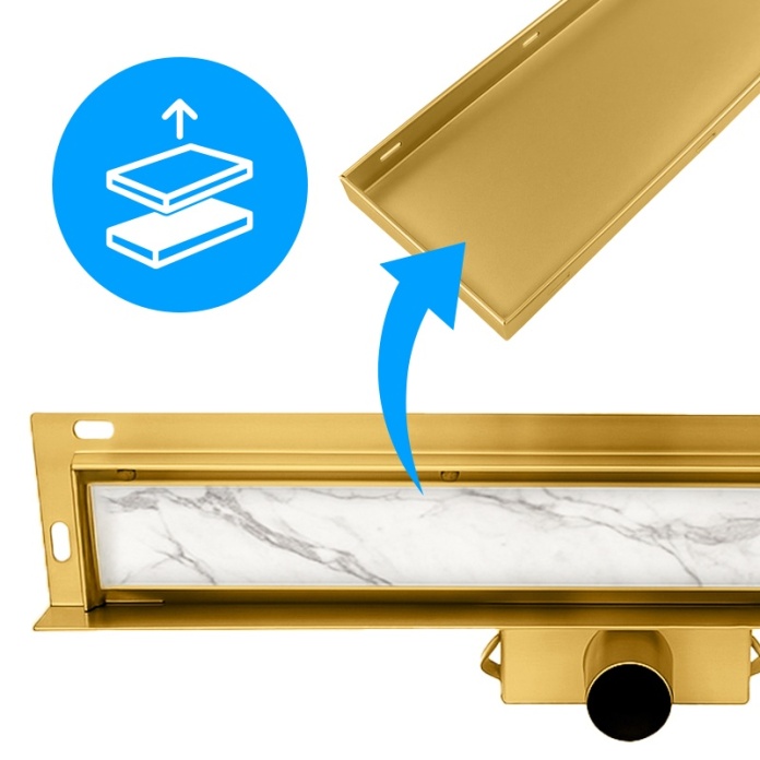Całość wieńczy nowoczesna maskownica typu 2 w 1, dająca możliwość spersonalizowania wykończenia. Można ją wyłożyć taką samą płytką jak resztę ściany, by stała się niemal niewidoczna, lub pozostawić widoczną złotą powierzchnię. Dzięki temu można stworzyć strefę prysznicową idealnie wpisującą się w nowoczesne aranżacje typu walk-in.