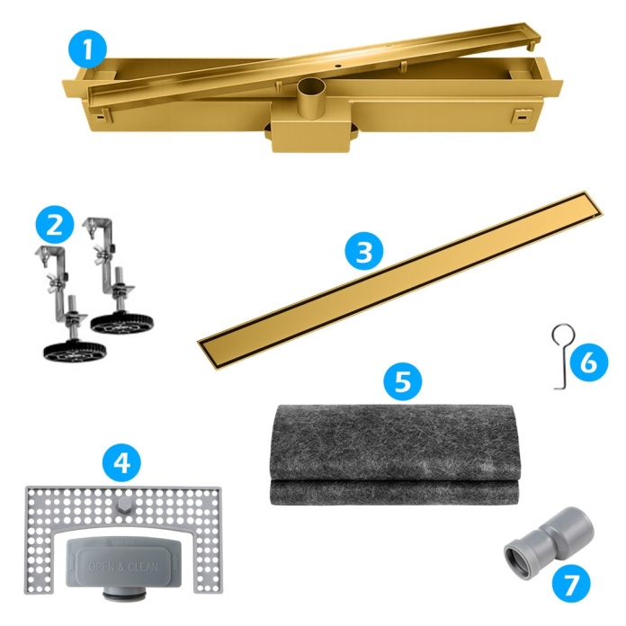 ODPŁYW LINIOWY ŚCIENNY 80 CM ZŁOTY NISKI SYFON WYSOKA PRZEPUSTOWOŚĆ DL04