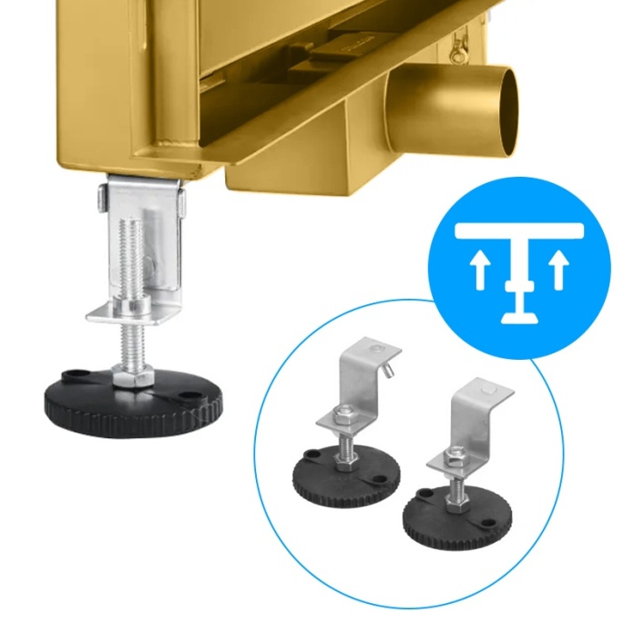 Regulowane nóżki to praktyczne rozwiązanie, które znacznie ułatwia montaż odpływu liniowego. Dzięki nim można precyzyjnie wypoziomować i ustabilizować całą konstrukcję, idealnie dopasowując ją do wysokości wylewki. Gwarantuje to poprawny przepływ wody i solidne osadzenie, co jest kluczowe dla bezproblemowego użytkowania przez długie lata.