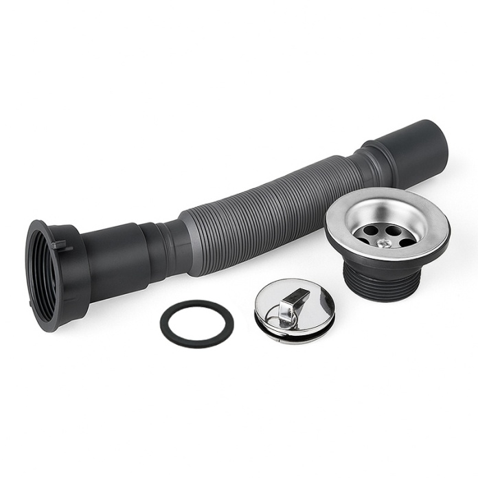 • Uniwersalna i regulowana konstrukcja – Elastyczna, harmonijkowa budowa rury odpływowej pozwala na swobodne dopasowanie jej długości (w zakresie 28-70 cm) i kształtu, co znacząco ułatwia montaż nawet w trudno dostępnych lub niestandardowych przestrzeniach pod zlewem.