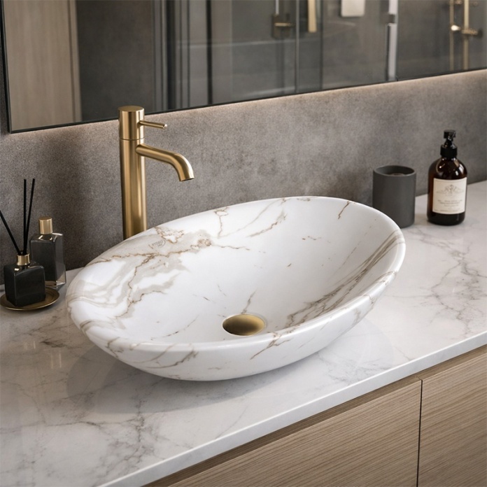 UMYWALKA NABLATOWA CERAMICZNA OWALNA LUMO-MAR1-530 BIAŁY MARMUR MAT 53x33 CM