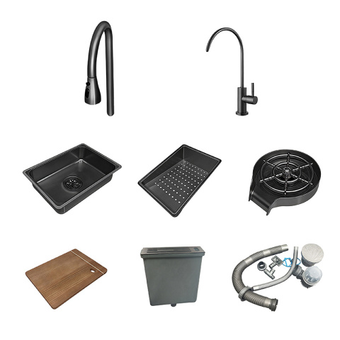 W komplecie ze zlewozmywakiem znajdują się: dozownik do mydła, koszyk/ociekacz, deska do krojenia oraz pojemnik z odpływem. Te praktyczne dodatki znacząco podnoszą funkcjonalność i komfort codziennego użytkowania.