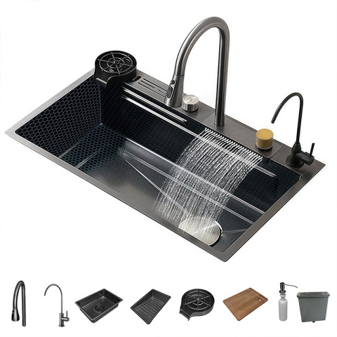 ZLEW KUCHENNY JEDNOKOMOROWY WODOSPAD WIELOFUNKCYJNY GRAFITOWY TOKIO 68x46