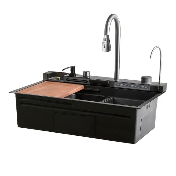 - Funkcja wodospadu – Wbudowany wodospad umożliwia delikatne, a zarazem wydajne napełnianie naczyń wodą. To praktyczne rozwiązanie, szczególnie przydatne podczas mycia dużych garnków i patelni.