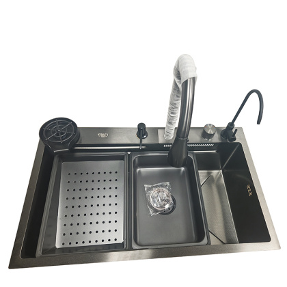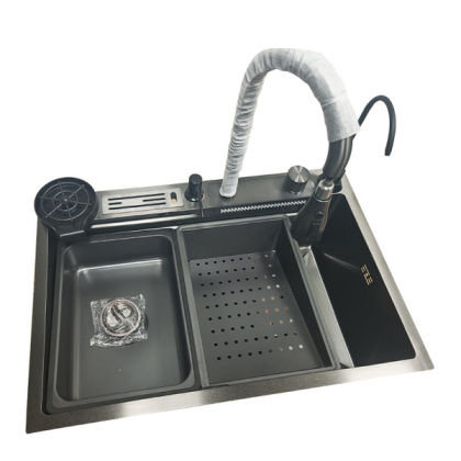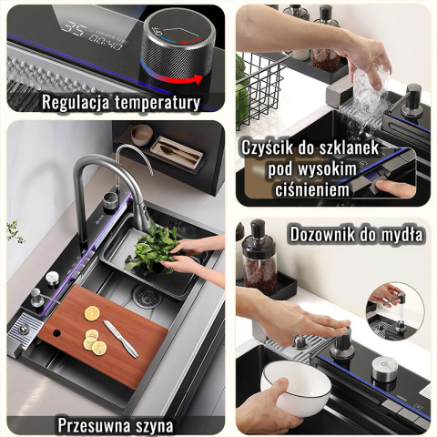 Bogaty zestaw akcesoriów- W komplecie ze zlewem znajdują się: dozownik do mydła, koszyk/ociekacz, deska do krojenia, pojemnik z odpływem oraz podświetlany panel. Te praktyczne dodatki zwiększają funkcjonalność i estetykę zlewozmywaka, czyniąc codzienne korzystanie z niego wyjątkowo wygodnym i przyjemnym.