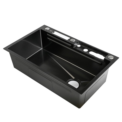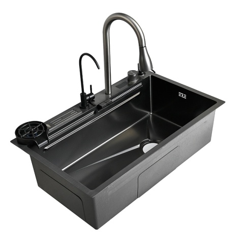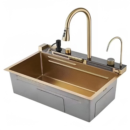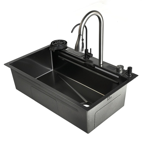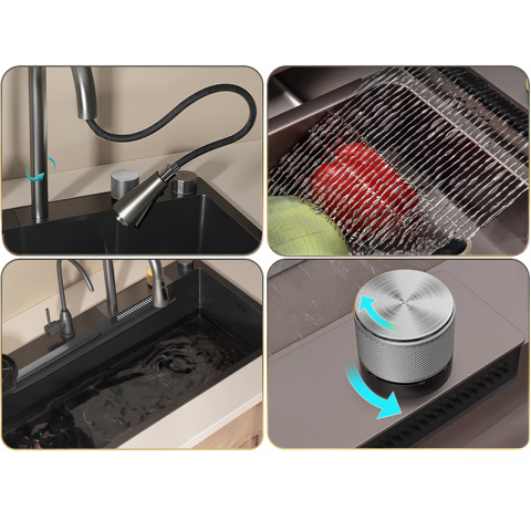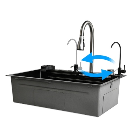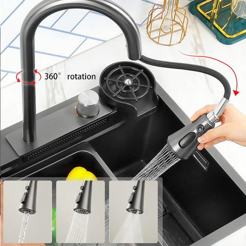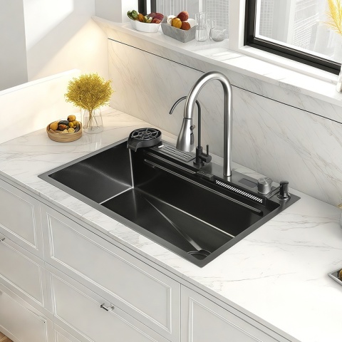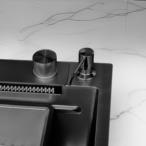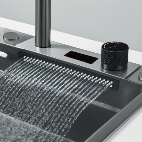 Wbudowany wodospad umożliwia delikatne, a zarazem wydajne napełnianie naczyń wodą. To praktyczne rozwiązanie, szczególnie przydatne podczas mycia dużych garnków i patelni.