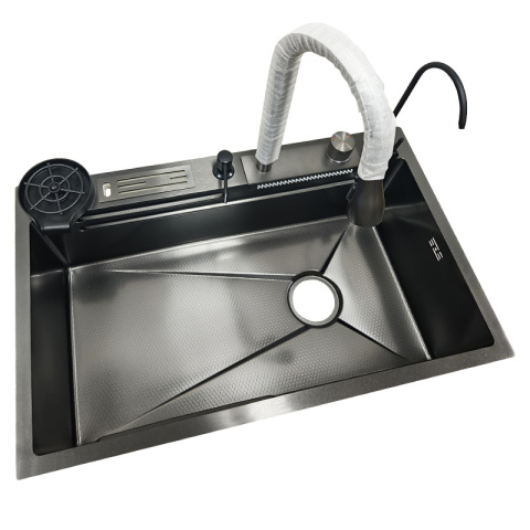 Wbudowany wodospad umożliwia delikatne, a zarazem wydajne napełnianie naczyń wodą. To praktyczne rozwiązanie, szczególnie przydatne podczas mycia dużych garnków i patelni.